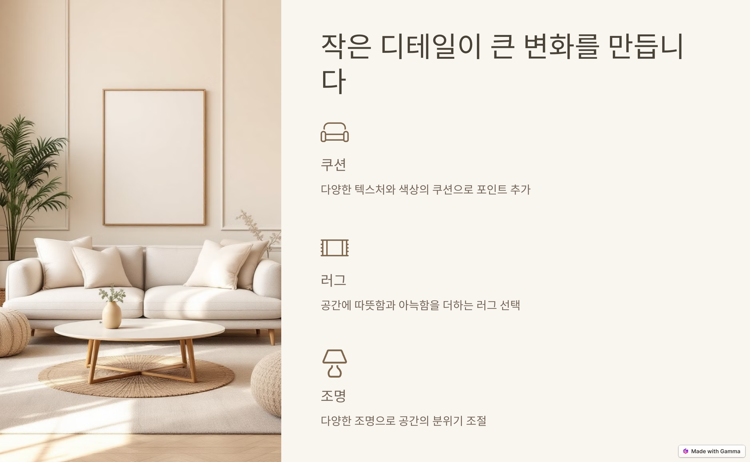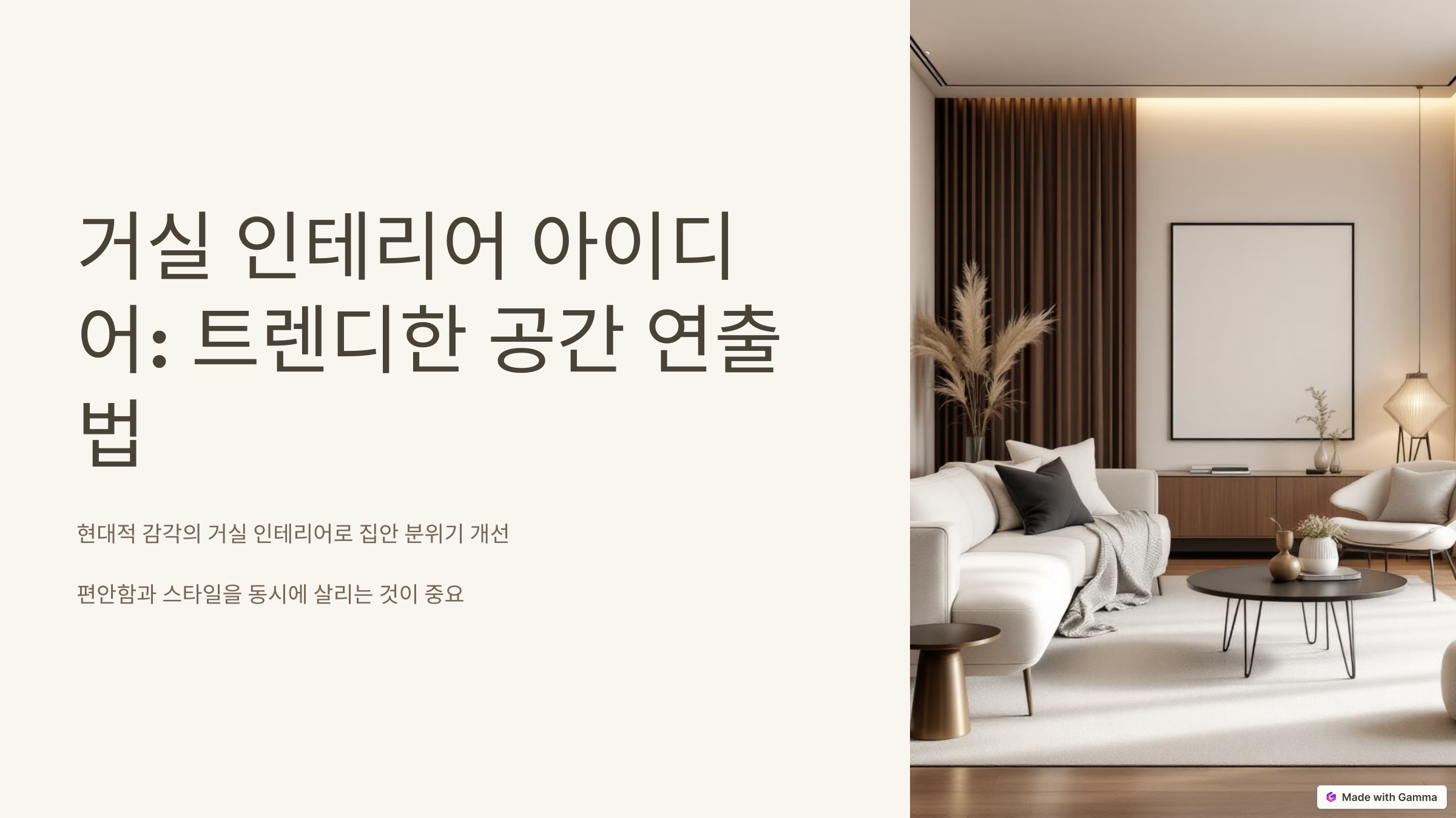거실 인테리어는 작은 디테일과 소품의 배치에 따라 큰 변화를 가져올 수 있습니다. 쿠션, 러그, 조명 등의 작은 요소들이 조화를 이룰 때 비로소 완성도 높은 공간이 연출됩니다. 트렌드를 반영하되, 무엇보다 자신의 취향과 라이프스타일에 맞게 공간을 꾸며보세요.