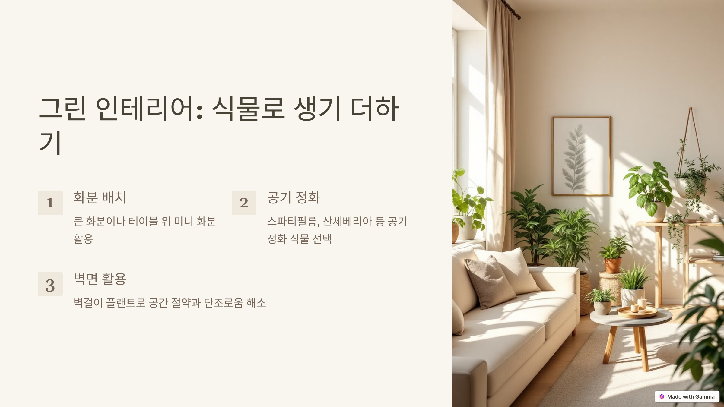 - 공기 정화 식물(예: 스파티필름, 산세베리아)은 실내 공기질 개선 효과도 있어 실용적입니다.