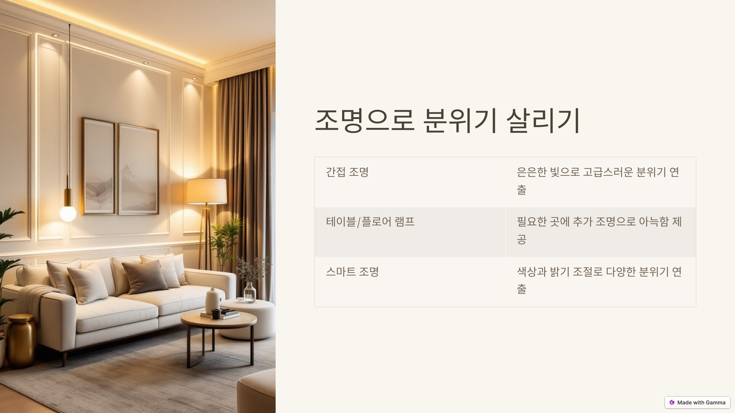 - 간접 조명을 활용해 은은한 빛을 만들어 보세요. 특히 거실 벽이나 천장에 간접 조명을 추가하면 고급스럽고 따뜻한 분위기를 연출할 수 있습니다.