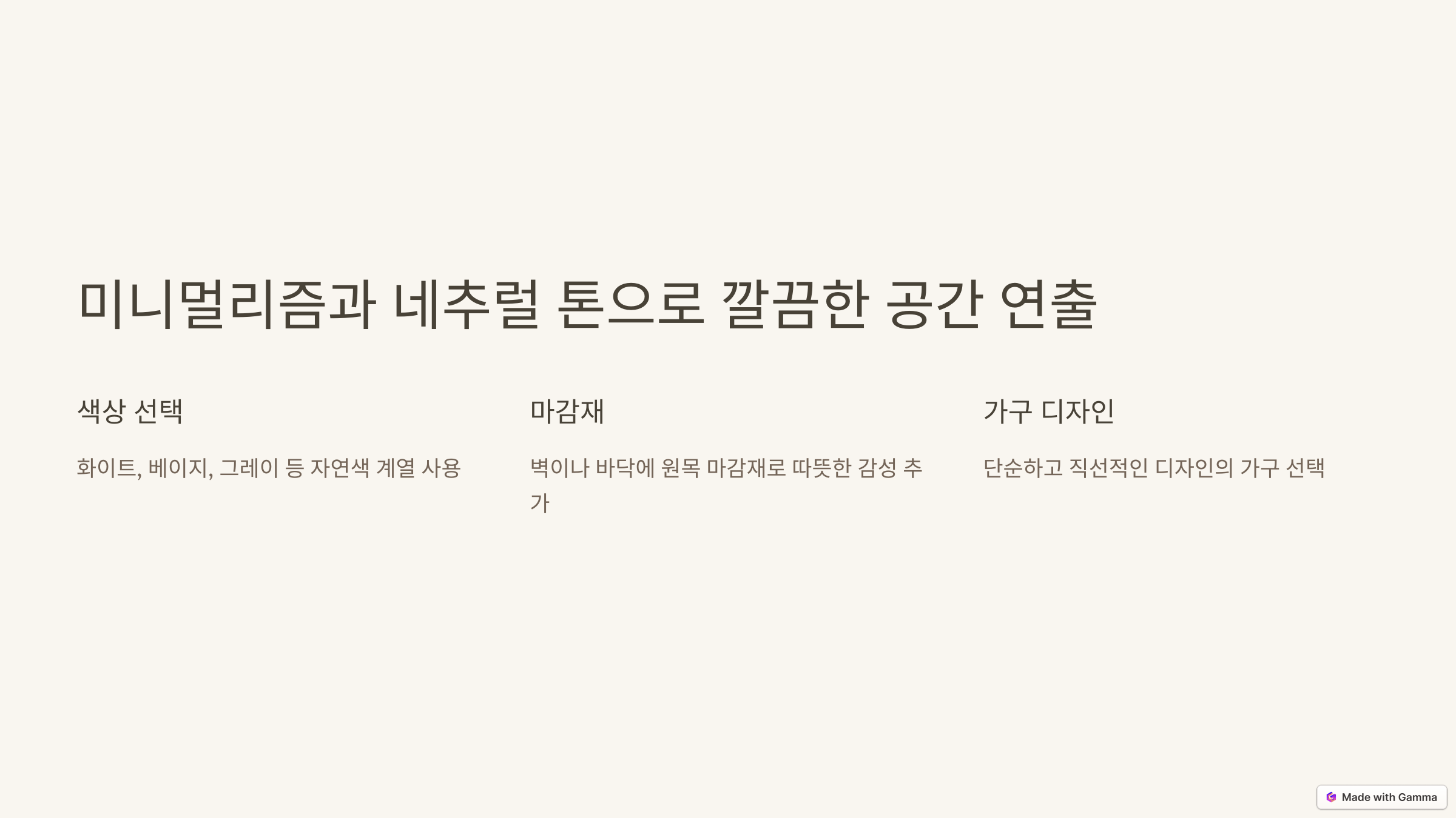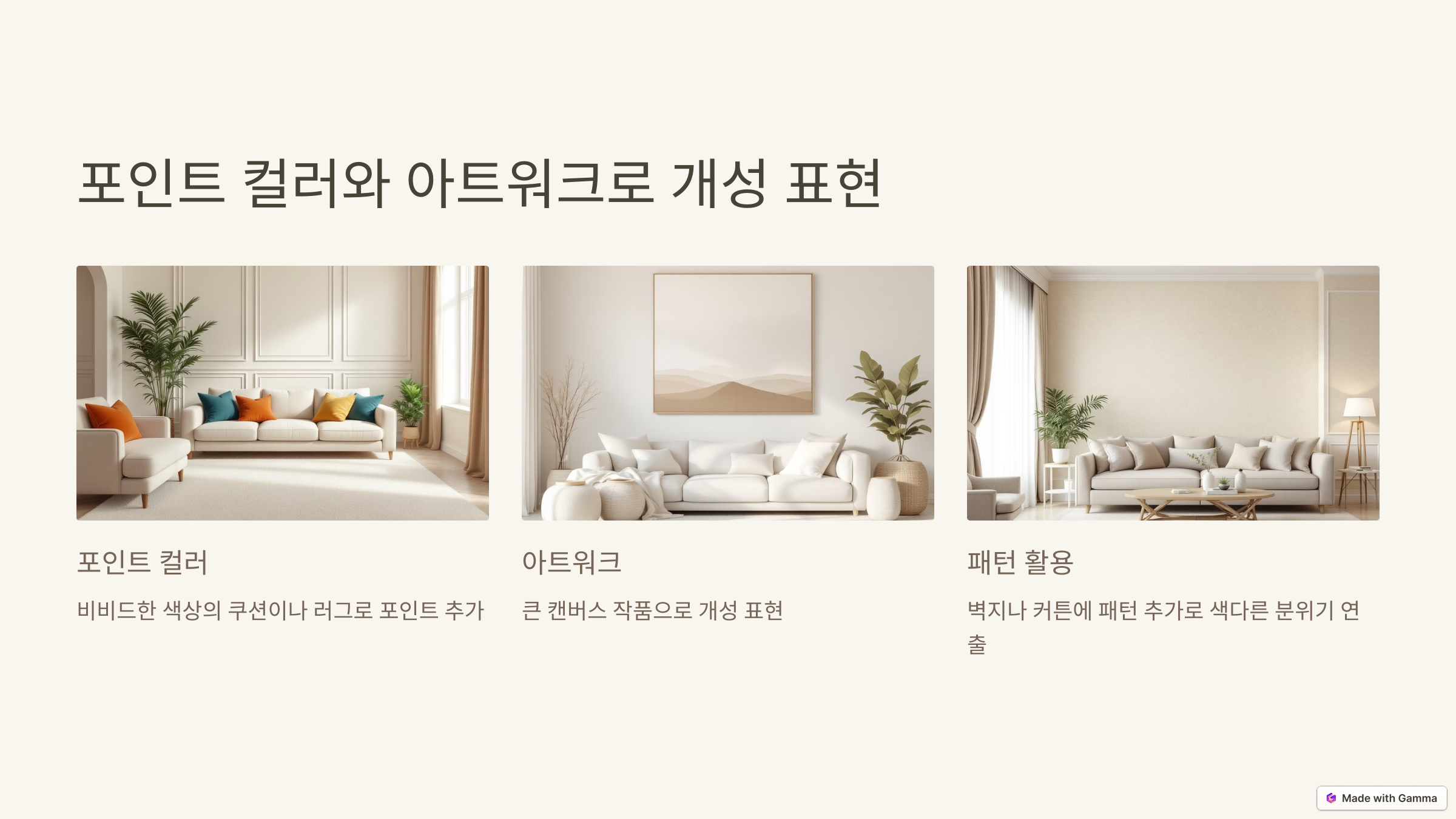 - 화이트, 베이지, 그레이 등 자연색 계열을 사용해 차분하고 부드러운 느낌을 연출하세요.
