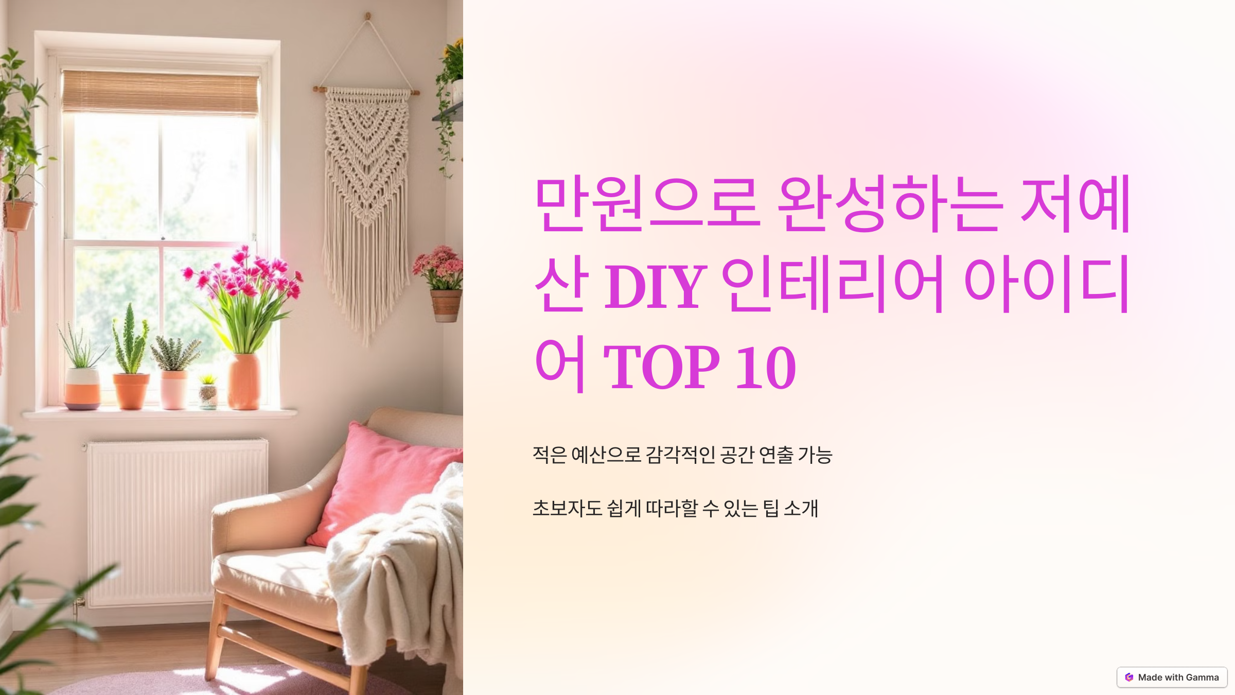 현대인들은 집을 꾸미고 싶어도 비용 부담 때문에 망설이는 경우가 많습니다. 하지만 적은 예산으로도 충분히 감각적인 공간을 연출할 수 있다는 사실, 알고 계셨나요? 오늘은 단돈 만원으로 집 분위기를 새롭게 바꿀 수 있는 저예산 DIY 인테리어 아이디어 10가지를 소개합니다. 초보자도 쉽게 따라 할 수 있는 팁이니, 지금 바로 도전해보세요!