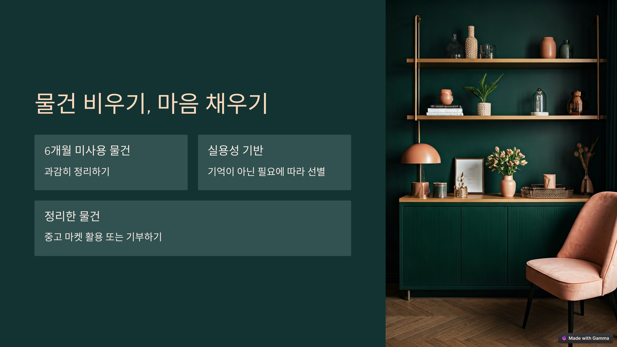 - 덜어내기: 쓸모없는 물건을 비우고 꼭 필요한 것만 남기기