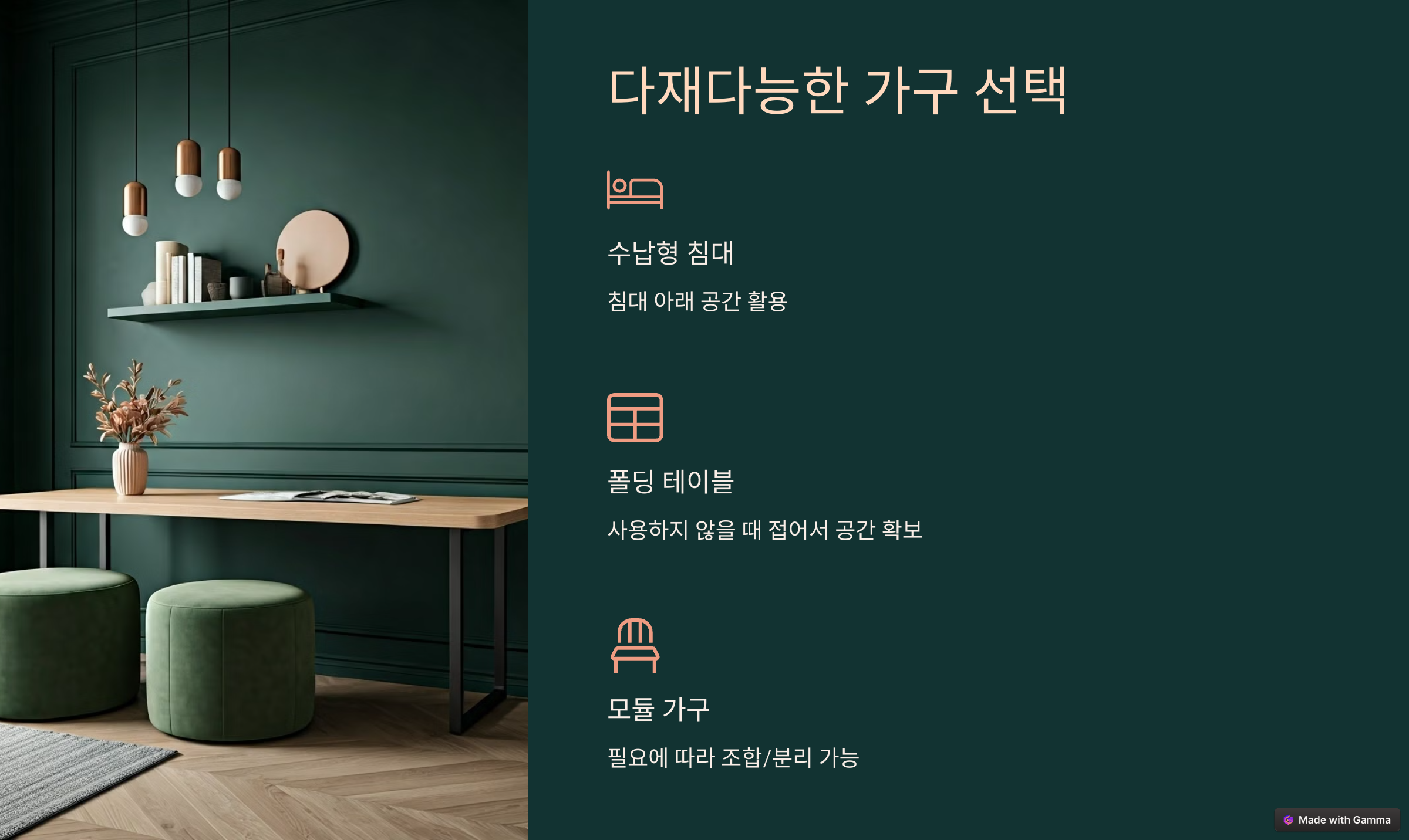 - 모듈 가구: 필요에 따라 조합하거나 분리 가능