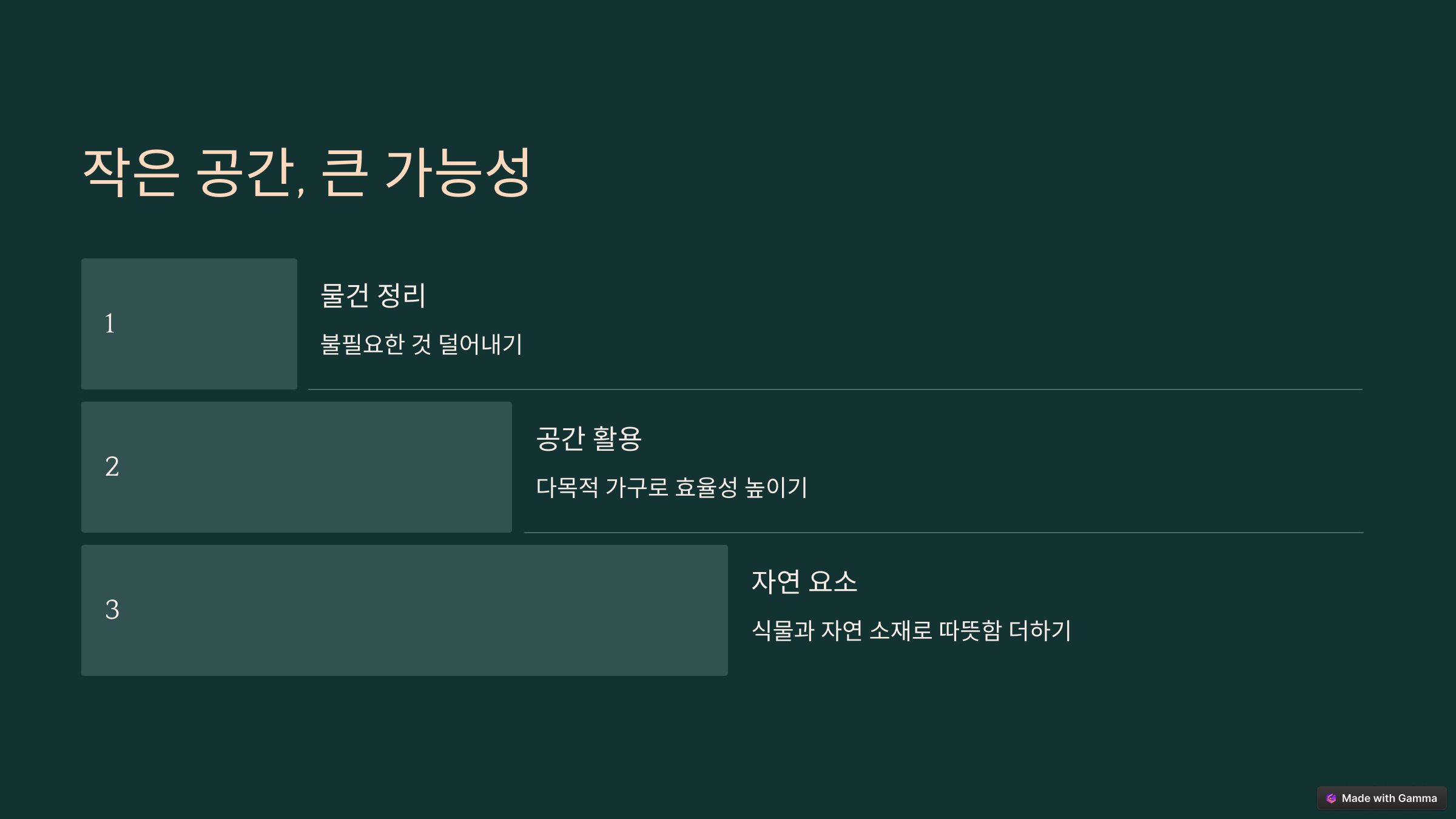 불필요한 물건을 덜어내고, 공간을 최대한 활용하며, 자연 요소를 더하면 당신의 작은 집이 따뜻하고 넓은 공간으로 변신할 수 있습니다.