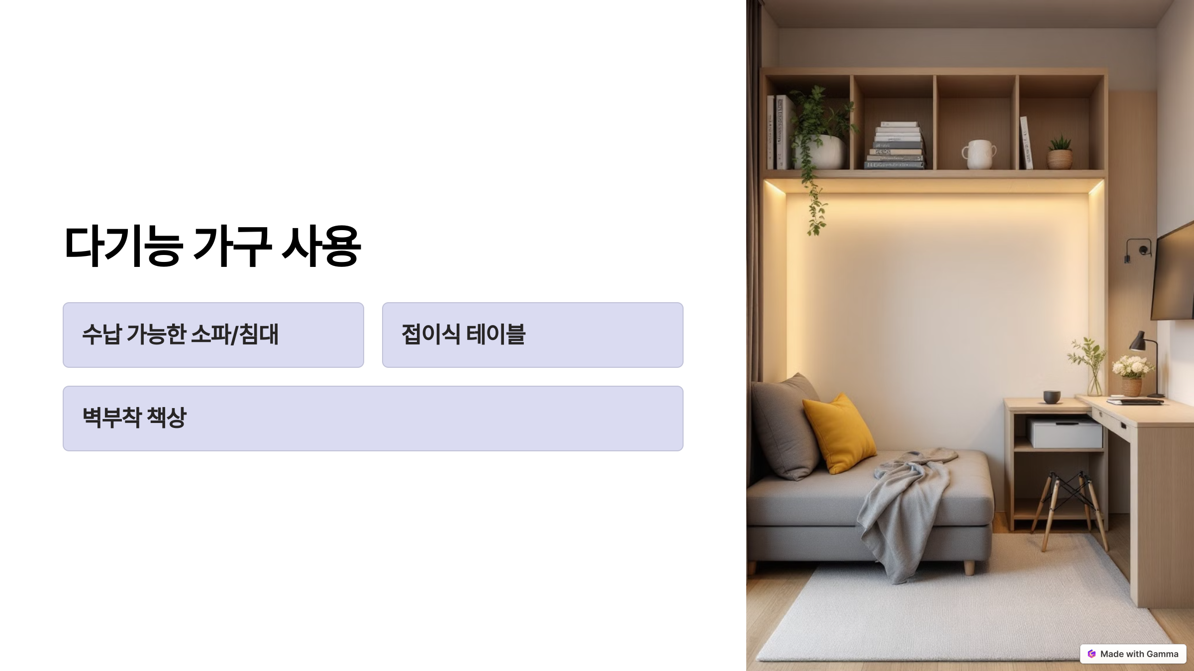 - 수납 가능한 소파나 침대를 선택하세요.
