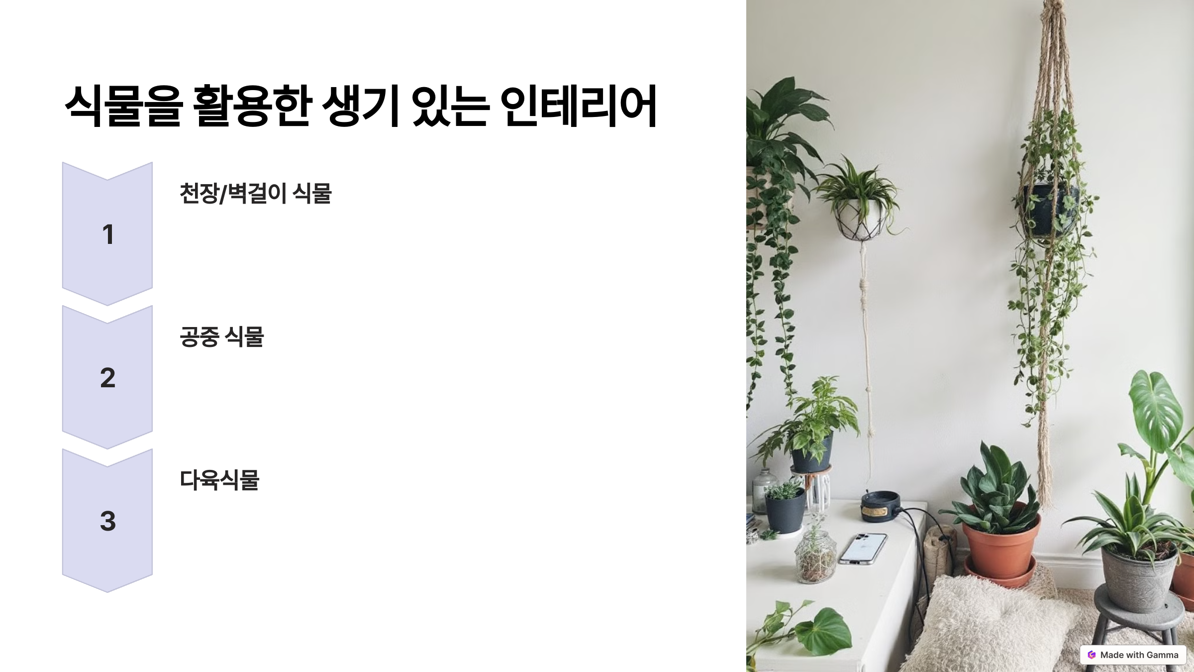 - 천장이나 벽에 걸 수 있는 식물은 공간을 차지하지 않으면서도 포인트를 줍니다.