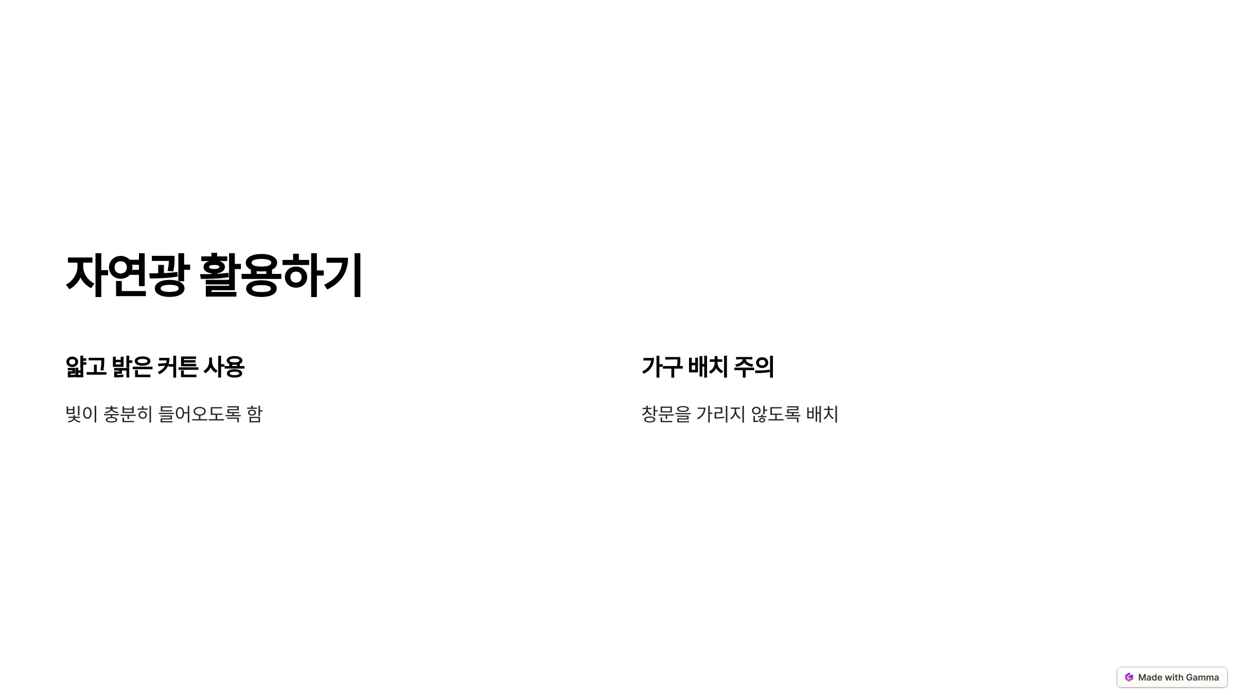 - 얇고 밝은 컬러의 커튼을 사용해 빛이 충분히 들어오도록 하세요.