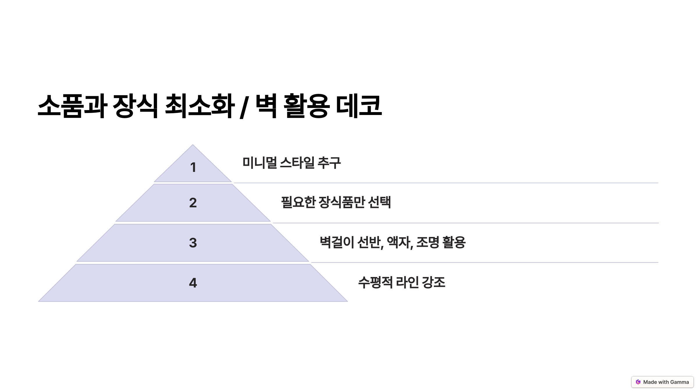 - 장식품은 꼭 필요한 몇 가지로 제한하고, 눈에 띄는 디자인을 선택하세요.