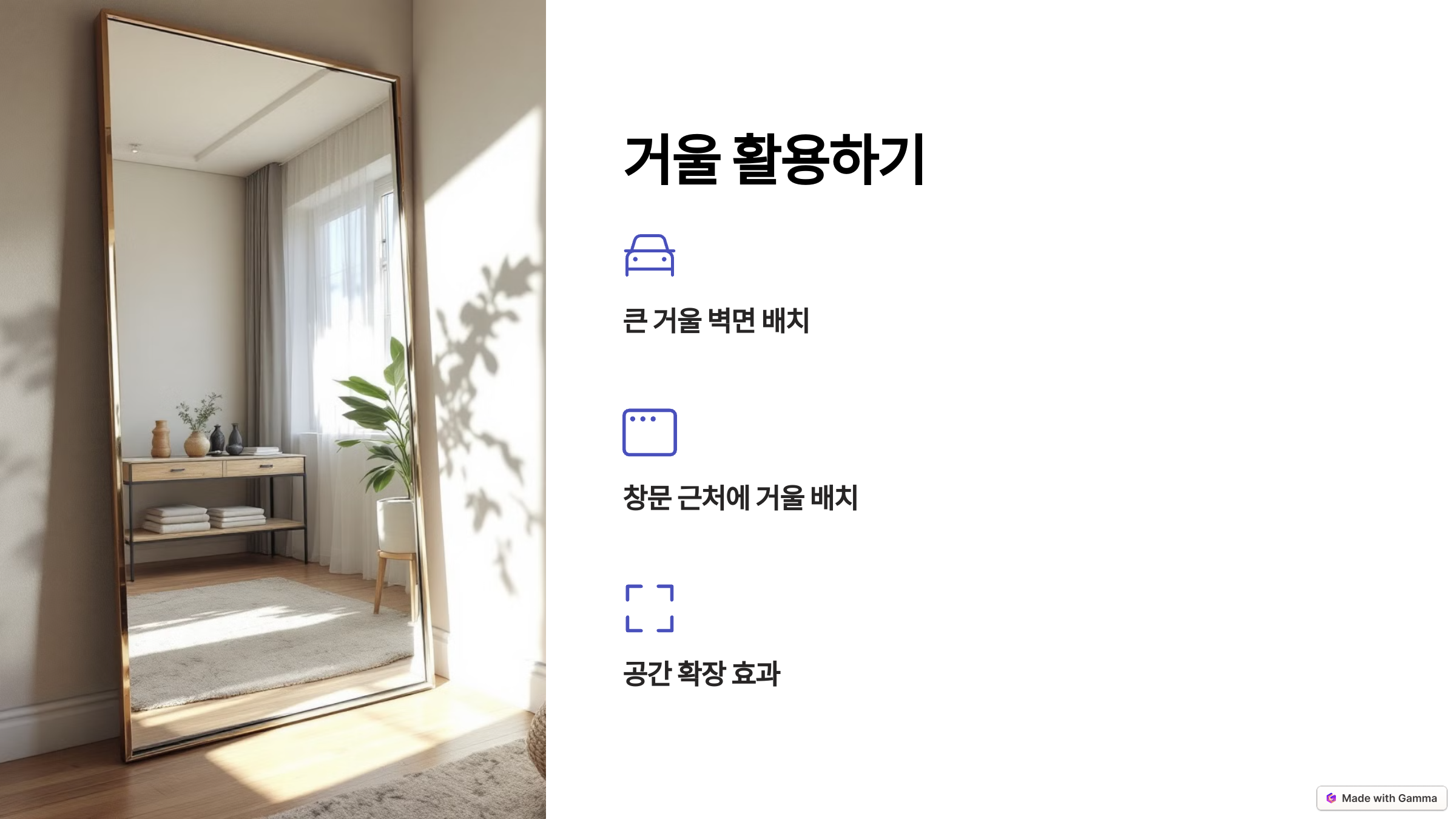 - 거울을 창문 근처에 놓으면 자연광을 반사시켜 더 밝고 활기찬 느낌을 줍니다.