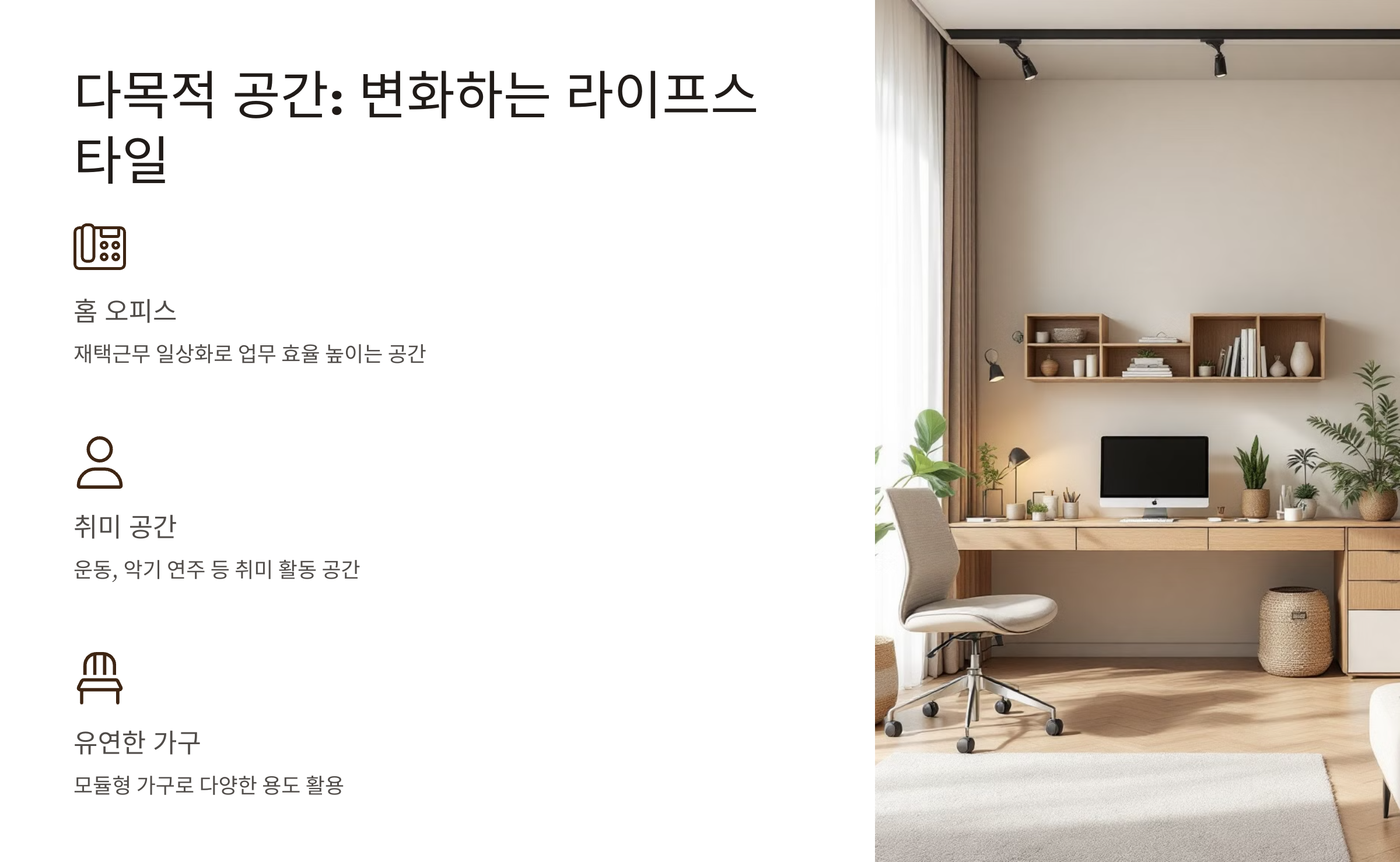 - 홈 오피스: 재택근무가 일상화되면서, 업무 효율을 높일 수 있는 홈 오피스가 필수 요소가 되었습니다.