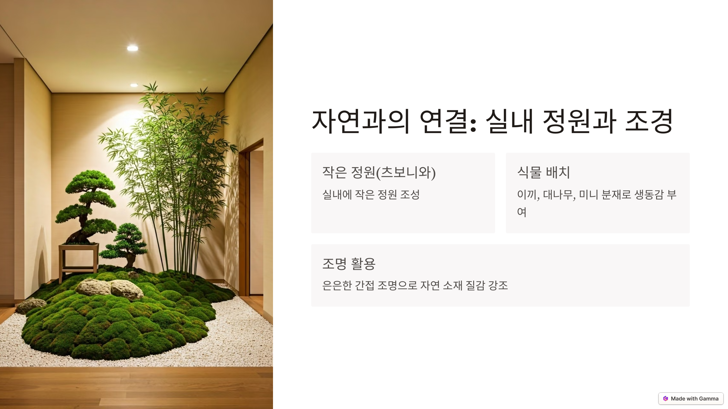 - 식물 배치: 공간 곳곳에 이끼, 대나무, 미니 분재 같은 식물을 두어 생동감을 줍니다.