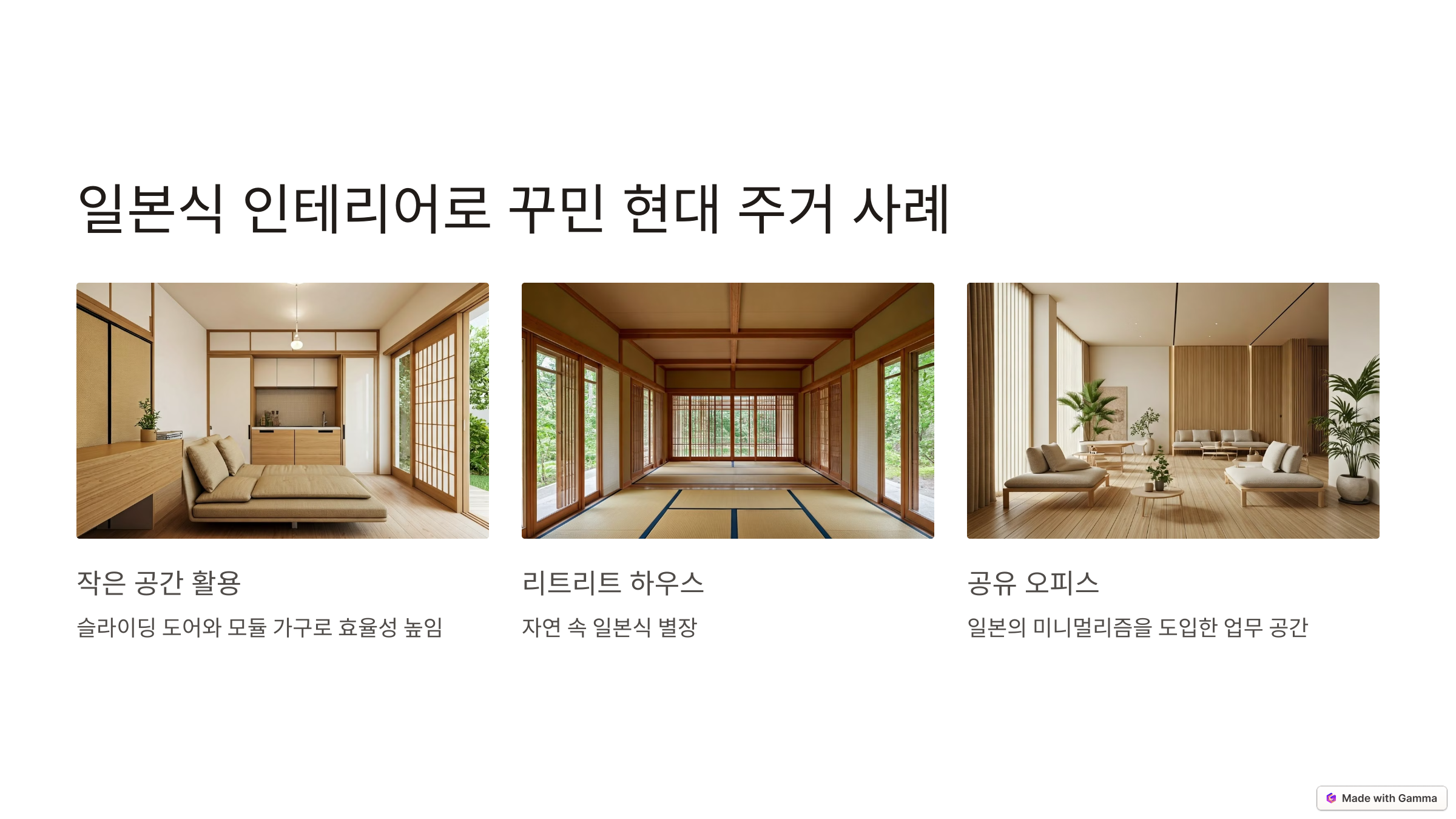 - 공유 오피스: 업무 공간에서도 일본의 미니멀리즘을 도입해 집중력을 높이고 스트레스를 줄이는 사례가 많습니다.
