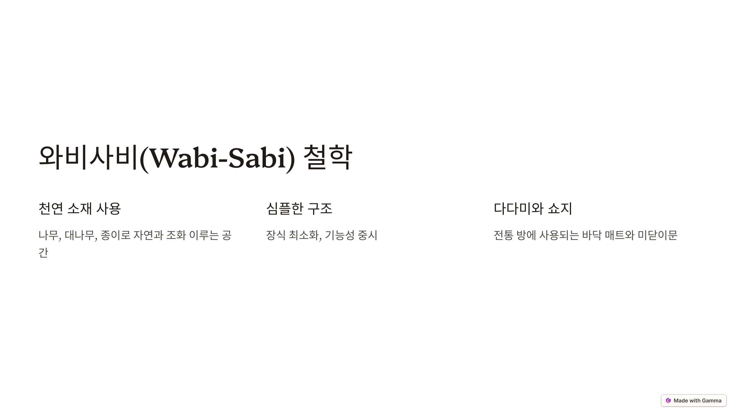 1. 🏯 전통적인 요소: 와비사비(Wabi-Sabi) 철학