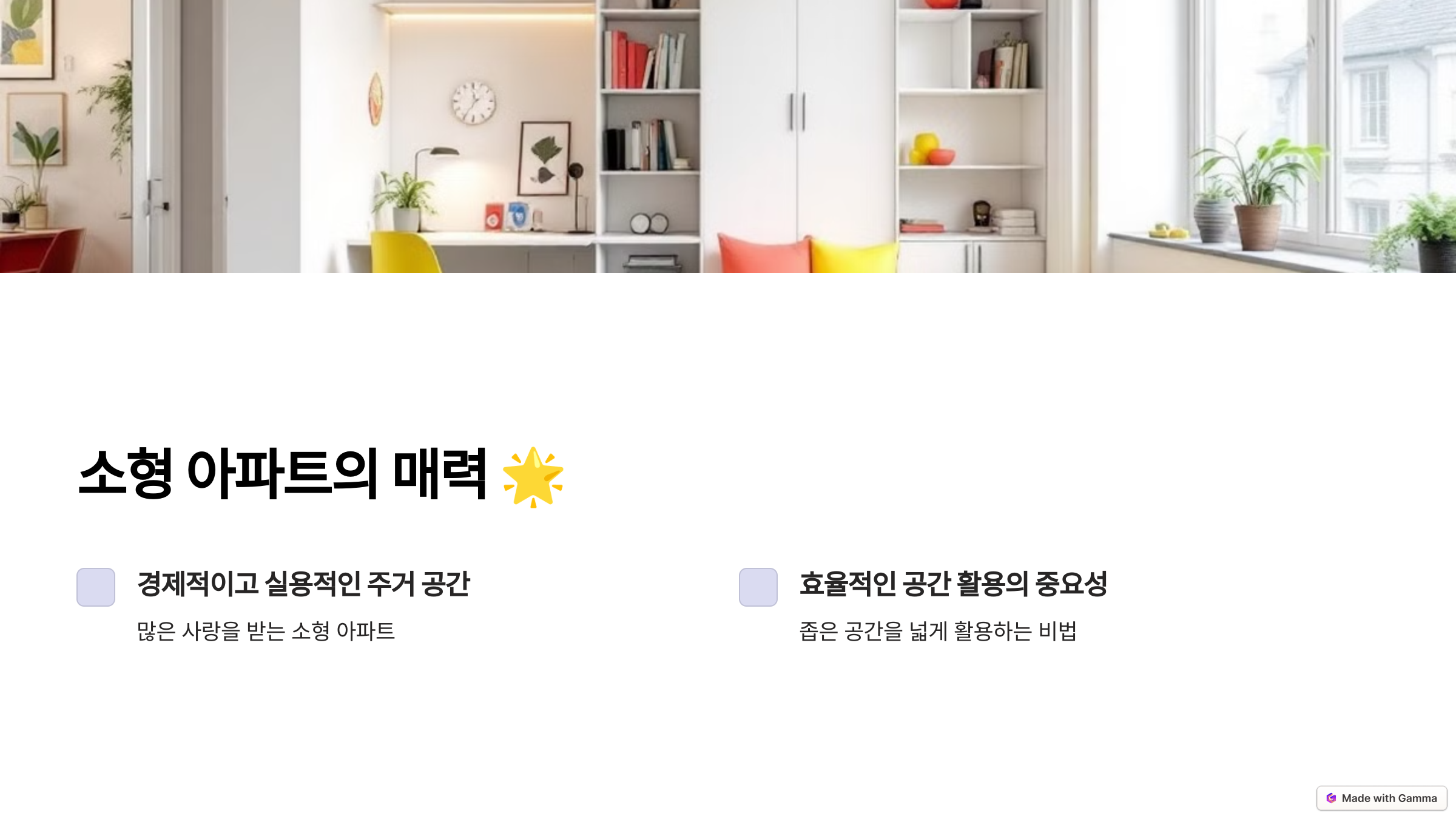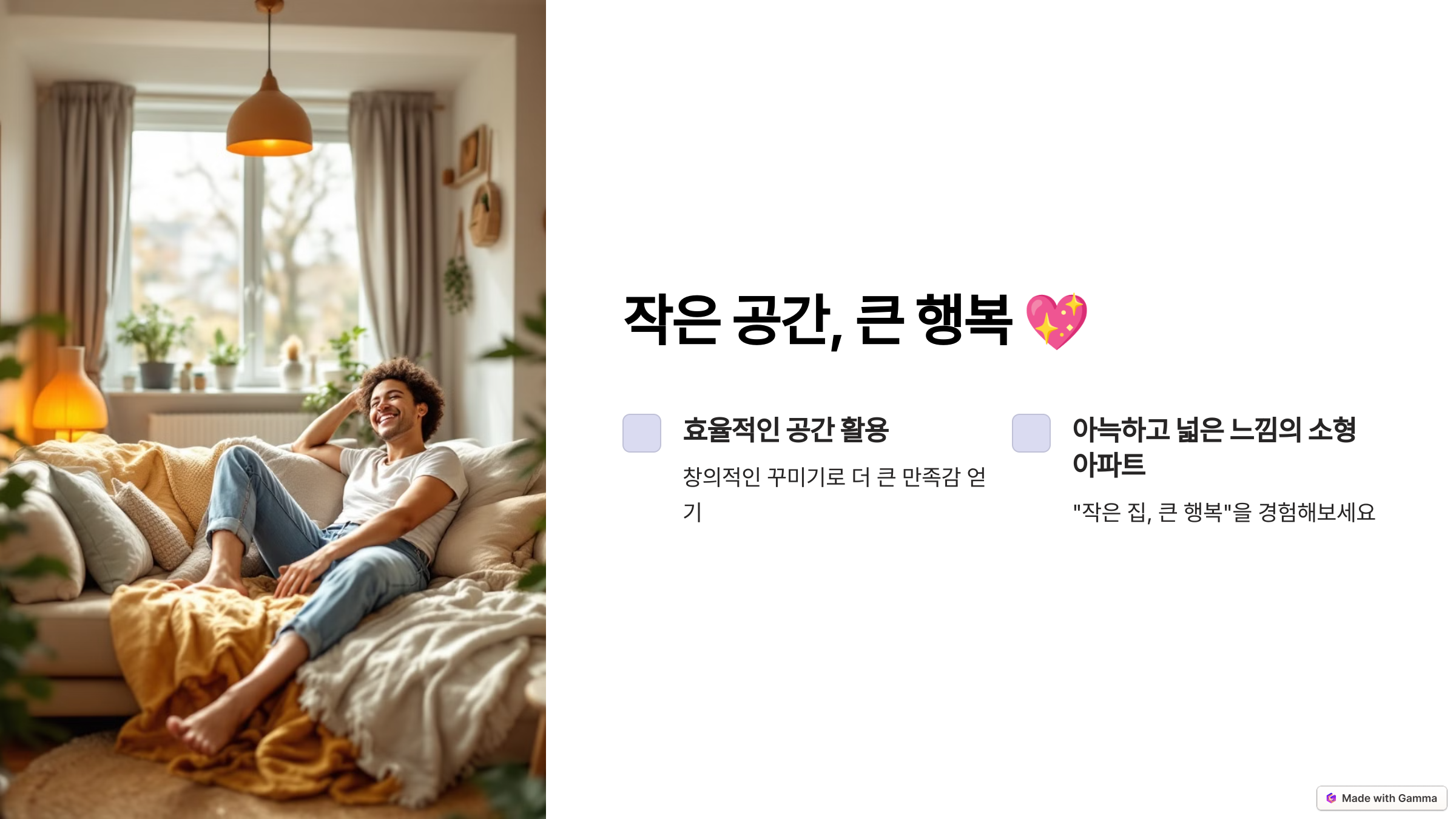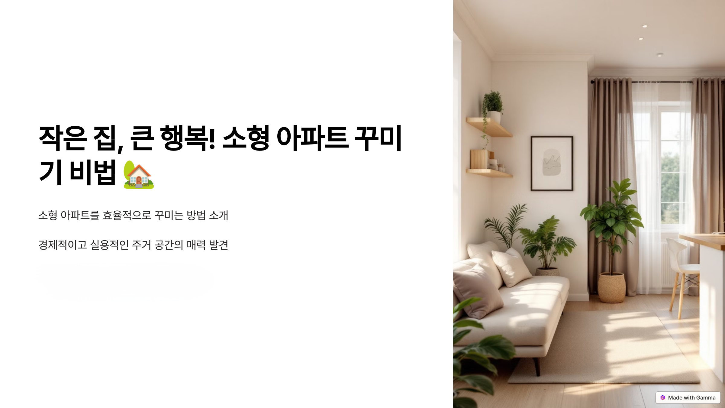 작은 아파트라고 해서 행복이 작아지는 것은 아닙니다. 오히려 공간을 효율적으로 활용하고, 창의적인 꾸미기를 통해 더 많은 만족감을 느낄 수 있죠. 오늘 소개한 비법을 실천하면 여러분의 소형 아파트가 더 넓고 아늑하게 느껴질 거예요. 이제 여러분도 *"작은 집, 큰 행복"*을 느껴보세요! 😊