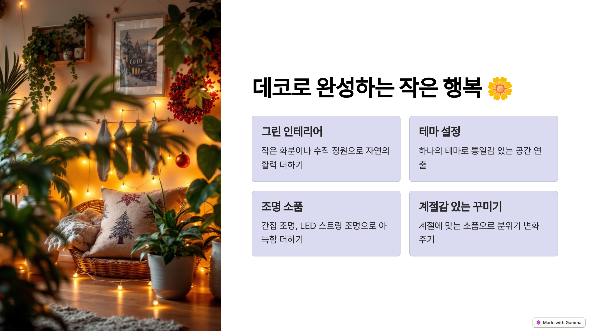 - 조명 소품: 따뜻한 느낌을 주는 간접 조명, LED 스트링 조명을 활용해 집안의 아늑함을 더하세요.계절감 있는 꾸미기