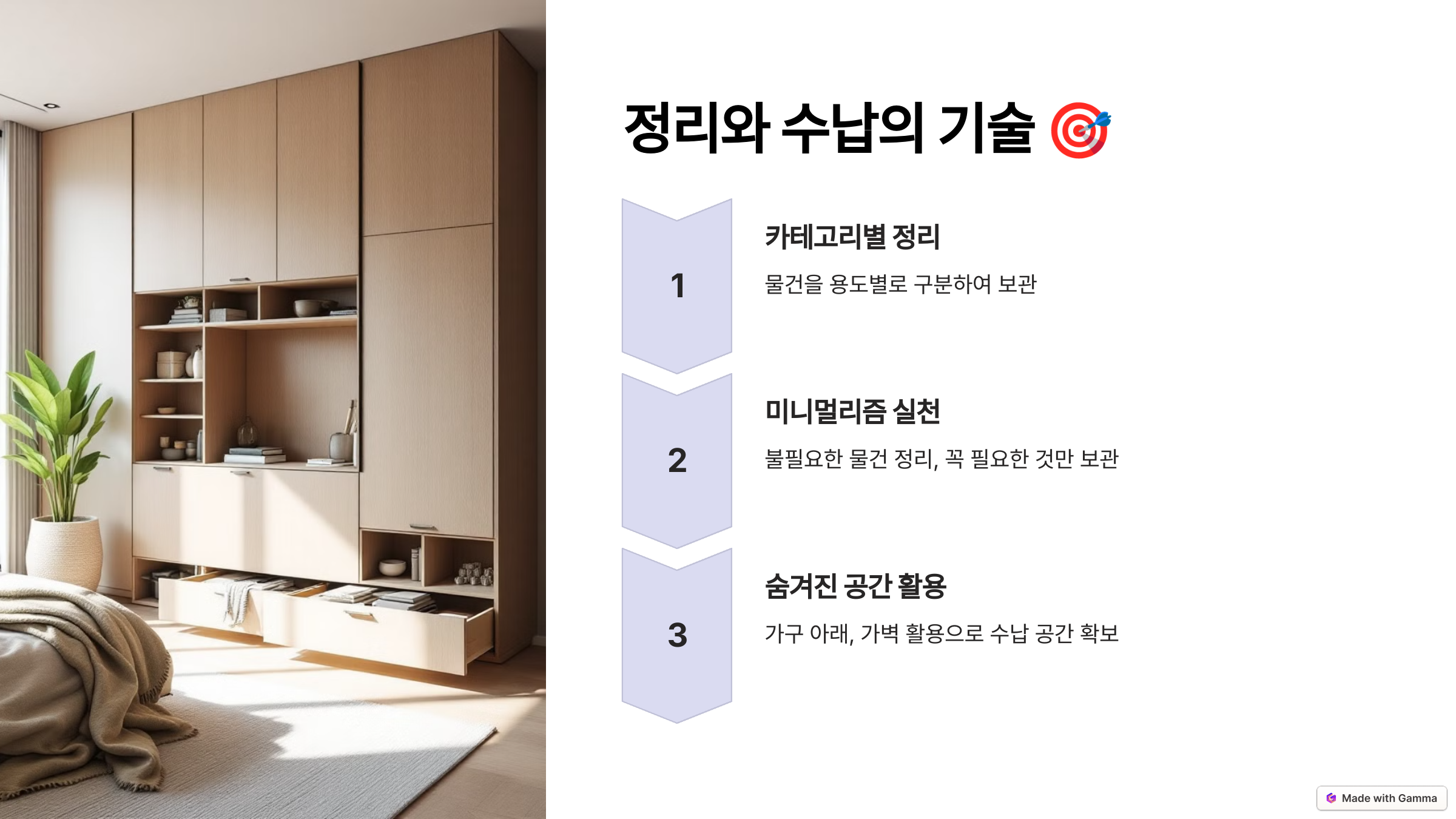 - 카테고리별 정리: 물건을 용도별로 구분하여 보관하세요. 예를 들어, 주방 용품은 투명 수납박스에, 계절 의류는 침대 아래 수납 공간에 보관합니다.