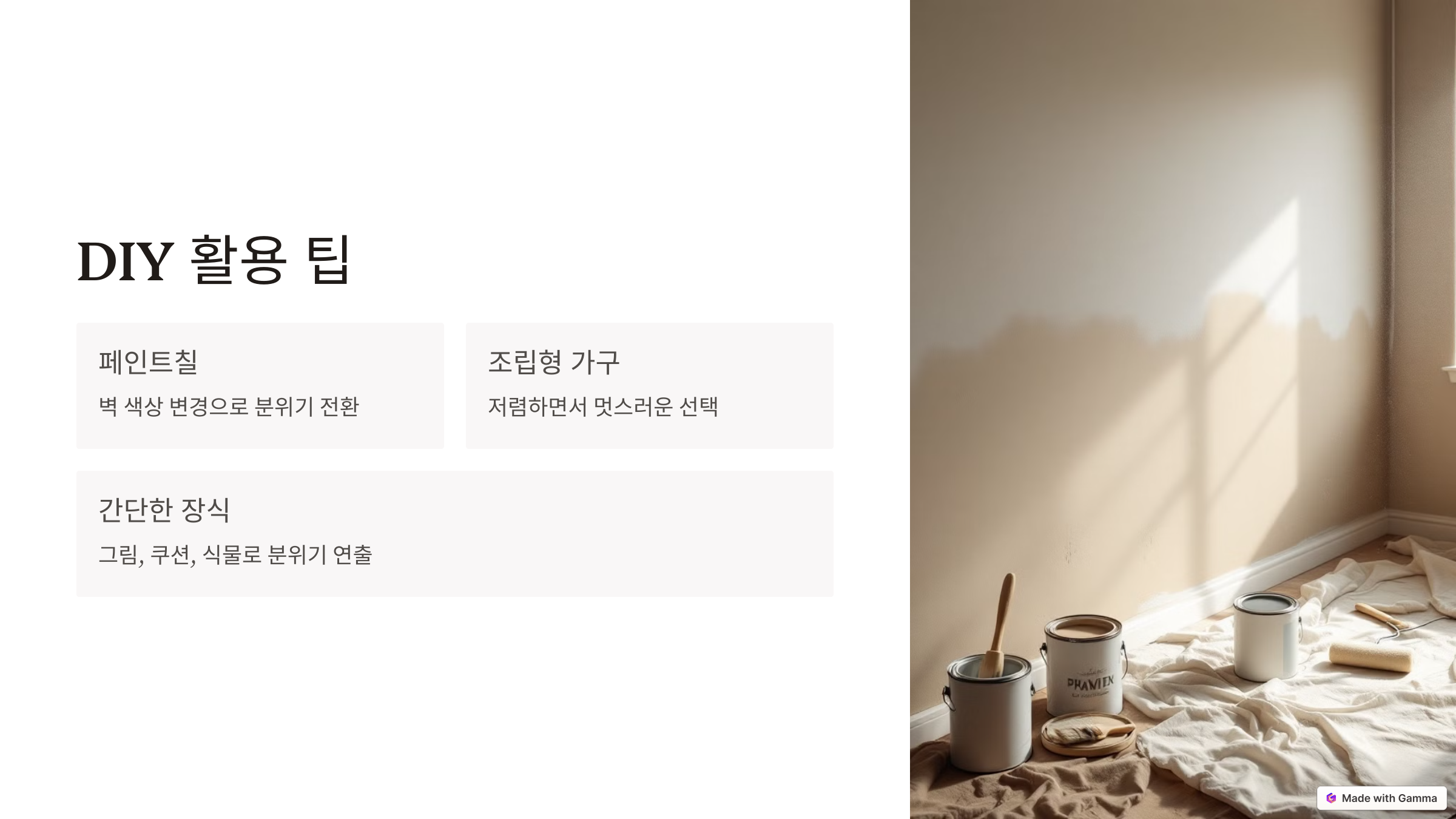 - 페인트칠: 벽을 새롭게 칠하면 공간의 분위기가 완전히 달라집니다.