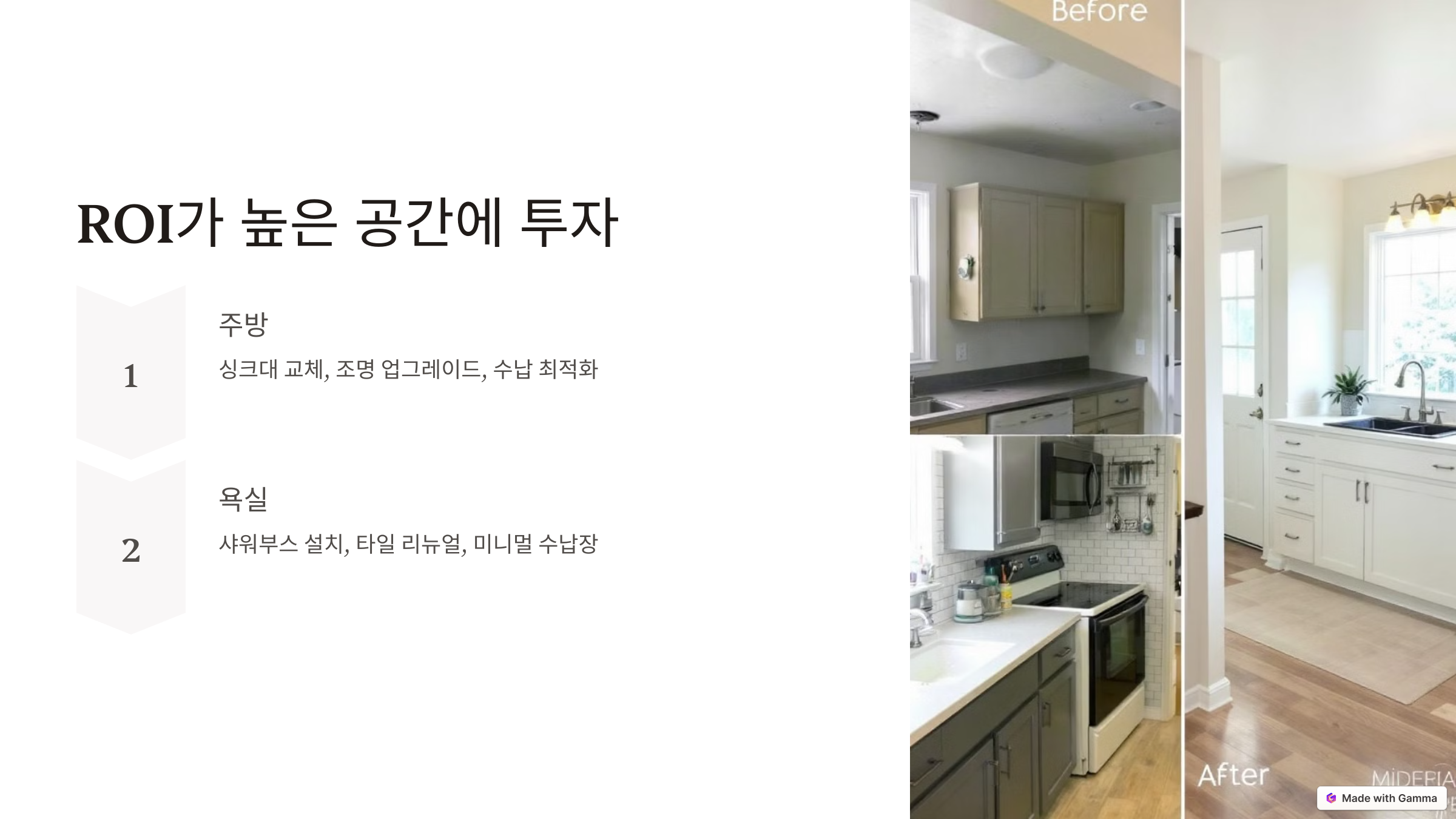 ROI가 높은 주방, 욕실, 외관에 투자하면 집값 상승에 큰 영향을 미칠 가능성이 높습니다. 전문가 상담 후 계획적으로 접근해 보세요.