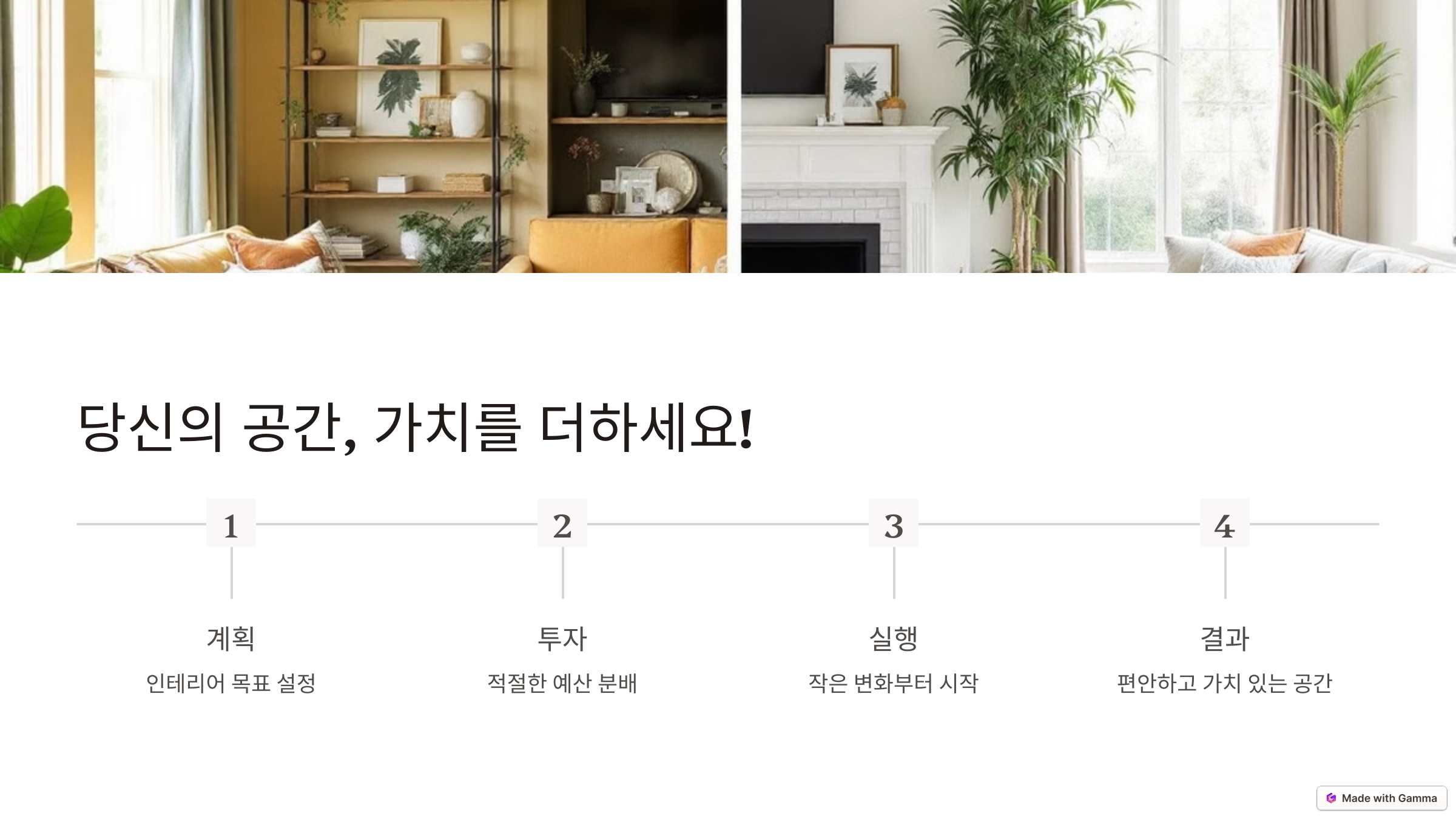 인테리어는 단순히 예쁘게 꾸미는 것이 아닙니다. 올바른 계획과 투자로, 당신의 집은 더 편안하고 가치 있는 공간으로 탈바꿈할 수 있습니다. 지금 바로 작은 변화부터 시작해 보세요! 주방의 조명, 거실의 소파, 혹은 침실의 벽지 하나만 바꿔도 그 효과는 엄청날 겁니다. ✨