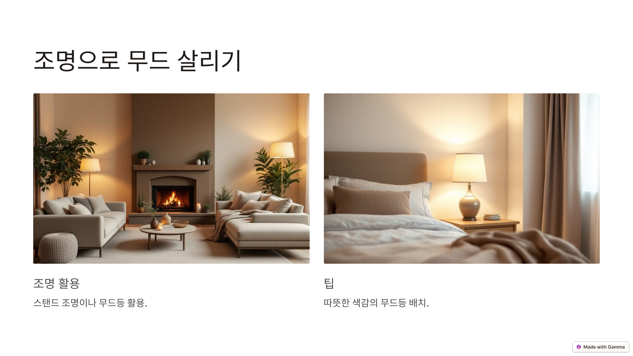 - 팁: 침실이나 거실에는 따뜻한 색감의 무드등을 배치해보세요. 편안한 분위기를 만들어 줍니다.