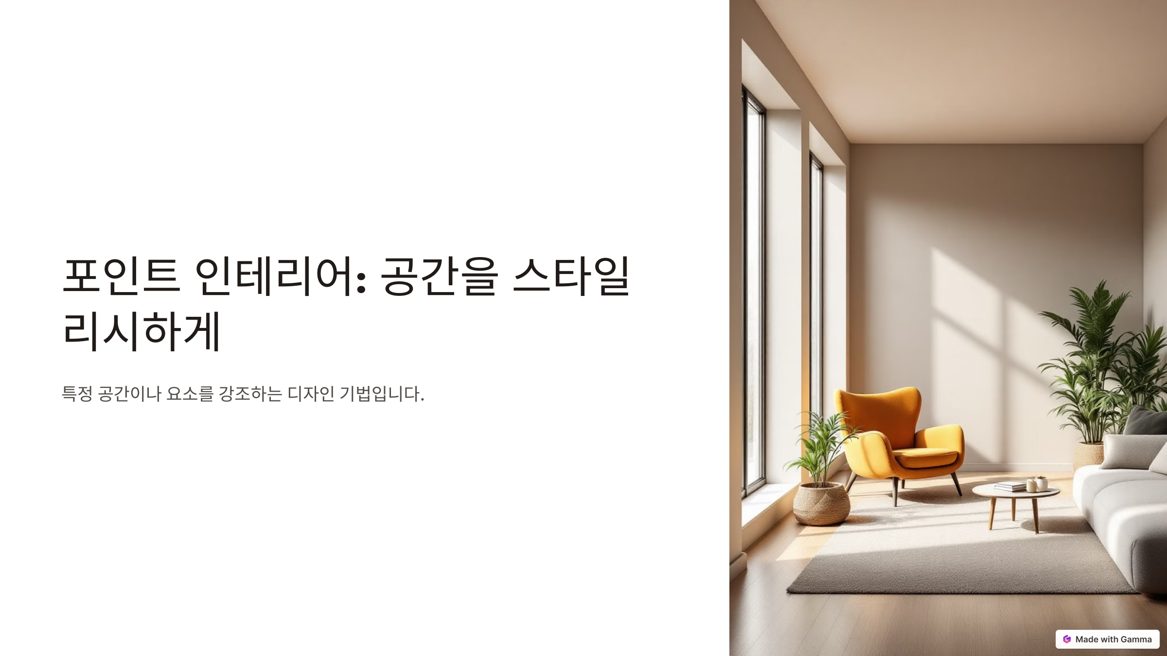 포인트 인테리어는 집안의 분위기를 바꾸고 개성을 표현하는 데 가장 효과적인 방법입니다. 큰 비용을 들이지 않고도 색다른 분위기를 만들 수 있어요. 컬러, 예술 작품, 거울, 조명, 식물 등 다양한 요소로 집을 스타일리시하게 꾸며보세요. 여러분만의 멋진 공간이 완성될 거예요! 🌟