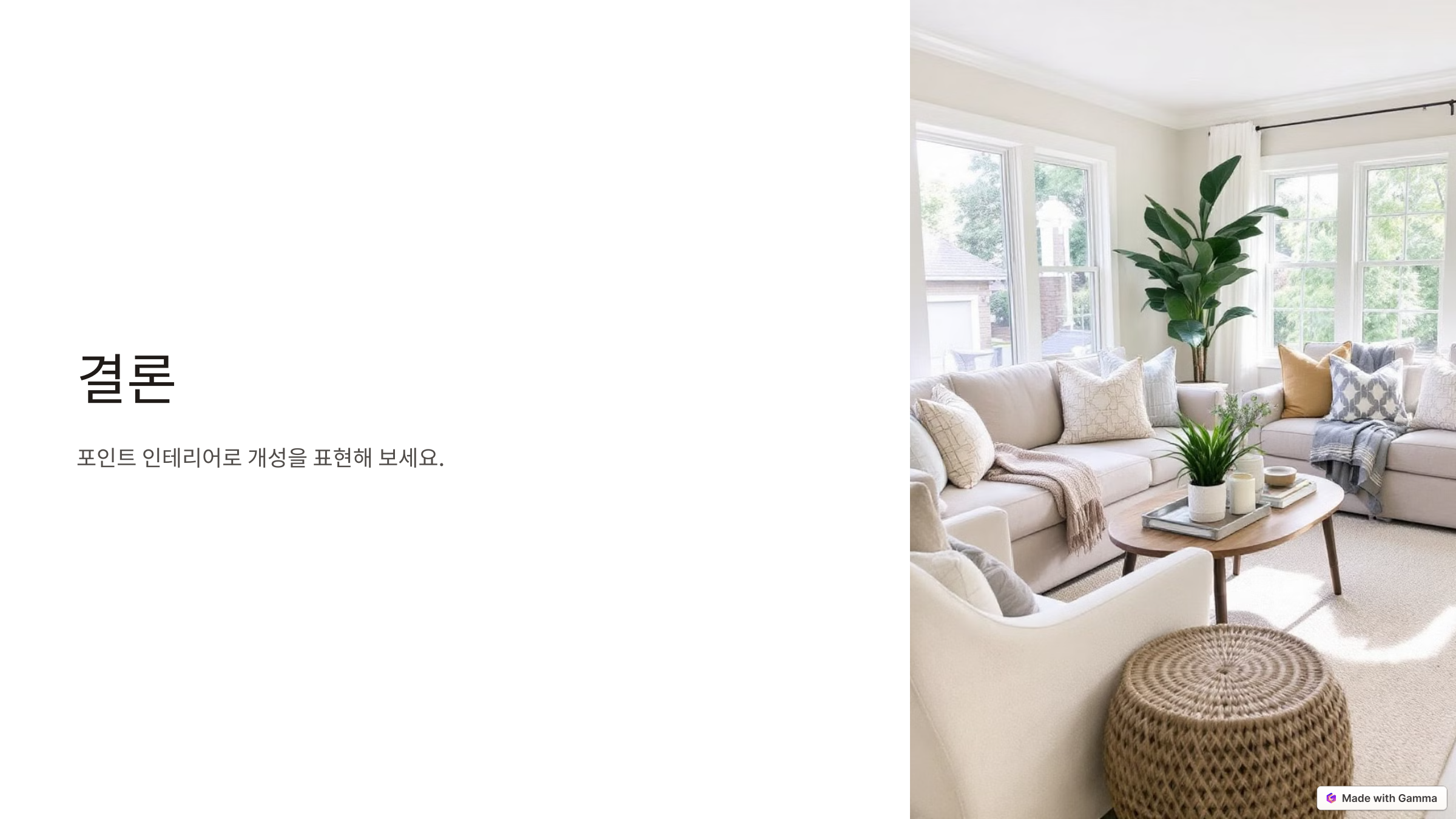포인트 인테리어는 개성을 표현하는 수단이기도 해요. 너무 트렌드에 치우치지 말고 자신이 좋아하는 색상, 패턴, 소품을 적절히 반영하세요.