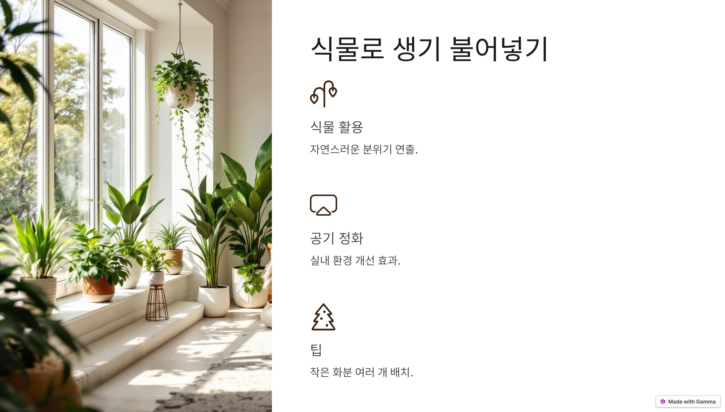 - 팁: 초록 식물을 배치할 때는 큰 화분 하나보다 작은 화분 여러 개를 놓아 균형을 맞추는 것이 좋아요.