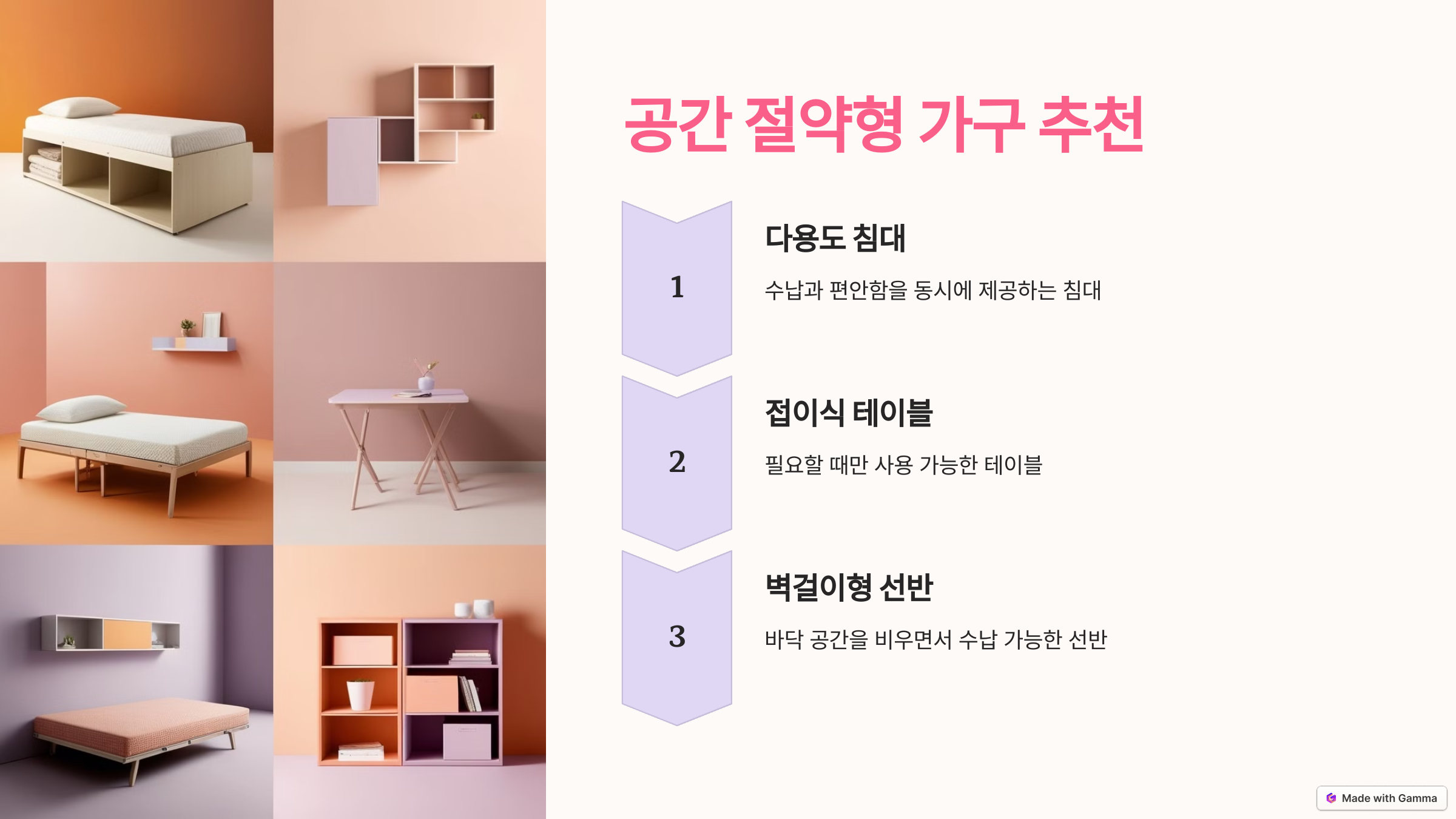 공간 절약형 가구를 잘 활용하면 작은 방도 충분히 넓고 쾌적하게 꾸밀 수 있어요.